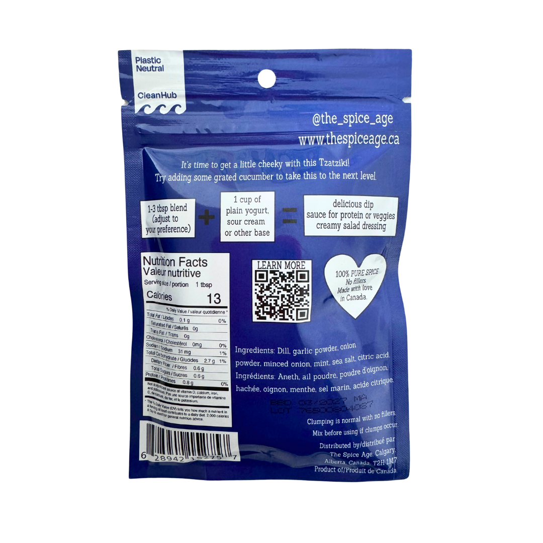 Ingredients: Dried dill, minced garlic, minced onion, garlic powder, onion powder, mint, citric acid.